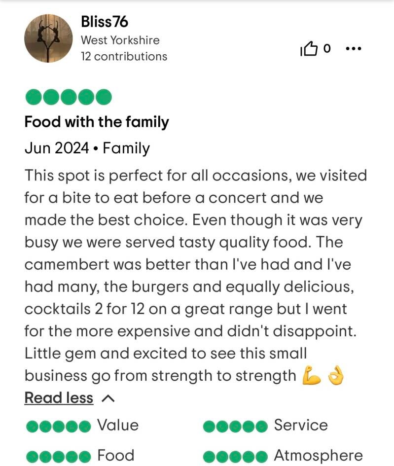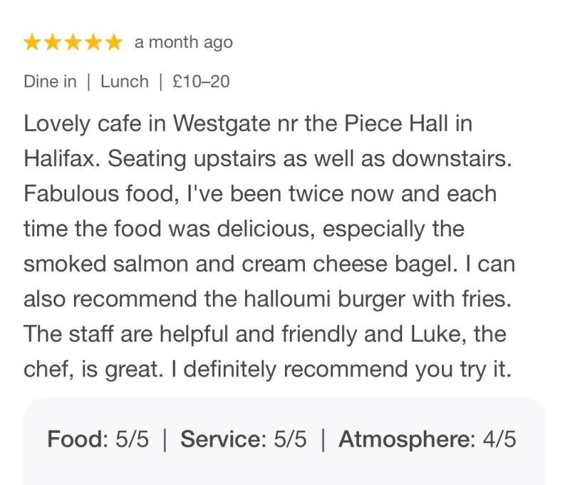 Visiting Piece Hall from out of town and came across this lovely little gem. Food was delicious and plentiful and the service was really efficient and friendly.